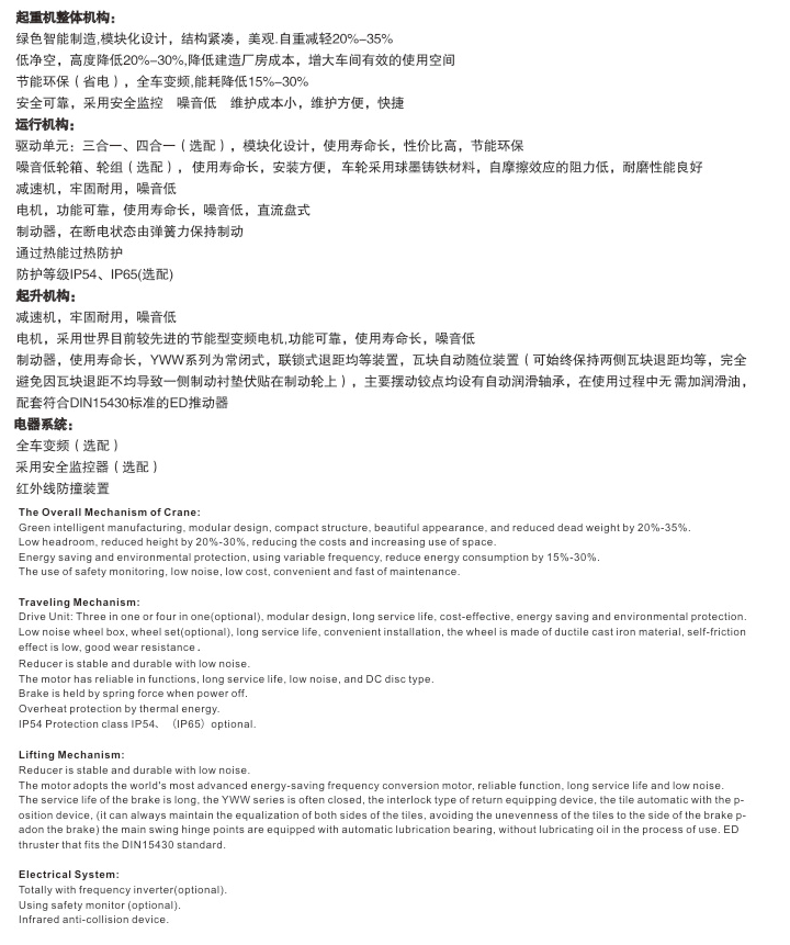 低噪音、免維護(降低檢修時間及維護成本低)(因結構簡單,故配套件品種少,后期方便采購,同時也降低了庫存)。我公司的歐標起重機通過變頻器調(diào)速,能有效減少用電量20%-30%,降低了使用成本,提高了使用效率。